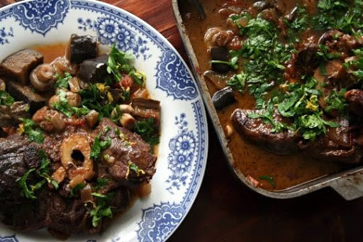 Heat the olive oil in a thick large cooking pan (with a lid). Meanwhile flour the shanks and shake off the excess flour. When the oil is hot, fry the shanks until brown.