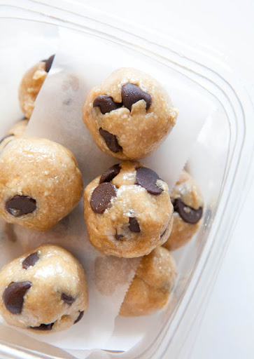 Rather than adding in chocolate chips, add raisins instead and add a dash of cinnamon to the batter for Oatmeal-Cinnamon-Raisin Raw Cookie Dough Balls