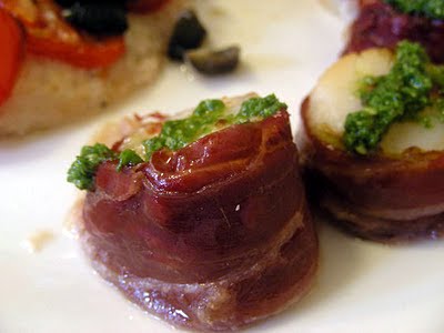 Just wrap the scallops with prosciutto. Half a slice of prosciutto will do. Since the scallops have a bit of a sticky texture when raw you don’t need anything to keep the prosciutto around each scallop. Preheat the oven to 375F. Brush each side of the scallops with olive oil and then season with salt (not too much because the prosciutto gets saltier when heated). Bake for about 15 minutes or until the scallops get golden.
