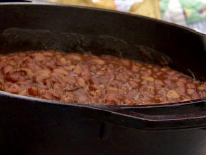 In a heavy pot (cast iron), saute the bacon pieces until halfway cooked and the fat is rendered. Add the green peppers and onions to the pot and cook until starting to get brown, about 3 minutes. Add the beans and cover with water by 1 inch. Bring to a boil, and then add the brown sugar, ketchup, mustard, chili powder, salt, pepper and garlic. Reduce the heat to a simmer, place on the lid and cook until the beans are tender and the liquid is thick 3 to 4 hours.