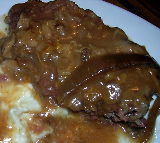 1 Heat oil in a skillet over med/high heat. 2 Put flour, salt and pepper in a zip lock bag and mix well. Add the cube steaks one at a time, close bag, and shake to coat in flour. 3 Add steaks to hot oil and brown on each side. Transfer steaks to the slow cooker. 4 Add sliced onion rings and 2 cups of water to the crockpot as well. 5 Cook on low setting for 8 hours. 6 Mix together gravy mix, onion soup mix and the cream of mushroom soup with the last 1 cup of water. Add this to the slow cooker and mix gently so you do not tear up the steaks. 7 Cook the cube steaks and gravy for 3 minutes longer. Serve over mashed potatoes or noodles.