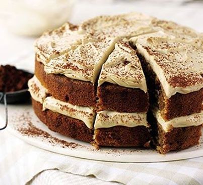 While the cakes cool, make the frosting. Tip the mascarpone into a large bowl and beat in the sugar and remaining coffee until smooth and creamy. Use about half of the frosting to sandwich the sponges together then, using a palette or cutlery knife, spread the rest of the frosting over the top of the cake. Decorate with a dusting of cocoa powder or drinking chocolate. If you’re making this cake to eat at home, it will keep covered in the fridge for 2-3 days.