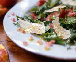 Remove the beef from the plastic wrap and arrange in one layer on a large plate. Layer a few arugula leaves, a drizzle of extra-virgin olive oil, salt and pepper, and cheese shavings over the raw meat.