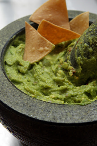 1. Mash the garlic and salt together in a mortar and pestle. (You can also make guacamole in a bowl using a fork or potato masher. If so, chop the garlic first.) Split the avocados in half and remove the pits. Scoop out the pulp with a soupspoon and dice the pulp, then add it to the garlic and mash it into the garlic along with the lime juice.
