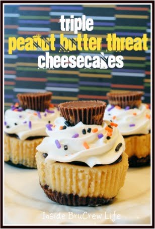 Preheat oven to 350* Beat cream cheese until very creamy. Add the sugar and beat on low until fluffy. Add in the eggs, sour cream, honey, and peanut butter. Beat until all combined. Place a large unwrapped peanut butter cup in the bottom of each cupcake liner. Spoon enough batter over top to fill the liners 3/4 full. Bake for 20-22 minutes. Cool in pan for about 15 minutes, then carefully remove to a wire rack to finish cooling. Place in the refrigerator for 1 hour. Heat whipping cream to boiling, remove from heat, and stir in chocolate chips. Continue stirring until chips are completely melted. Top each cheesecake with a generous spoonful. Cool. Before serving, top with cool whip, sprinkles and a small reeses cup. Keep refrigerated when not being consumed... but that is highly unlikely:-)