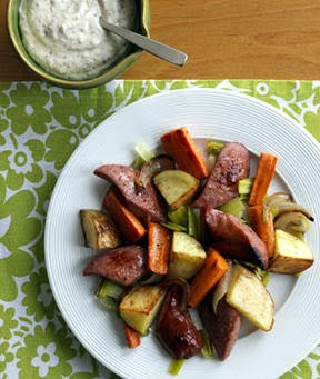 Remove pans from oven; toss. Add kielbasa to carrots and potatoes. Return to oven; roast 15 minutes more until vegetables are tender. Toss kielbasa with vegetables; pass sauce.