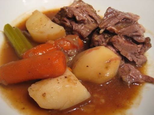 Place celery (if using), carrots and potatoes in the bottom of a 5-6 quart slow cooker. Place meat on top of vegetables. Top with onion and bay leaves.