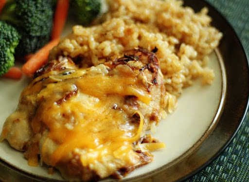 Spray 9x13 pan with cooking spray. Layer rice, 1 c. cheese, salt and pepper in pan. Place chicken breasts on top. Dob rounded teaspoons of cream of chicken soup over the chicken breasts and rice. Pour water on top and sprinkle with onion soup mix. Bake uncovered for 1 1/2 hours, checking water after 1 hour. (If water is absorbed before chicken and rice are completely cooked, you can add an additional 1/2 c. to keep moist) Remove from oven, sprinkle with remaining 1/2 c. cheese.