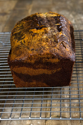 Marble the separate batters together in the prepared pan in the following manner: Begin by placing one portion of about 2 tablespoons of vanilla batter to the bottom center of the loaf pan (using spring-loaded ice cream scoops or a combination of spoons and spatulas). Shake the pan from side to side gently to spread the batter a bit. Place an equal portion of the chocolate batter in the center of the vanilla batter, and again shake the pan from side to side gently. Place a second portion of vanilla batter in the center of the chocolate batter, shake the pan again gently, and repeat with the chocolate batter, alternating until all the batter is in the pan.