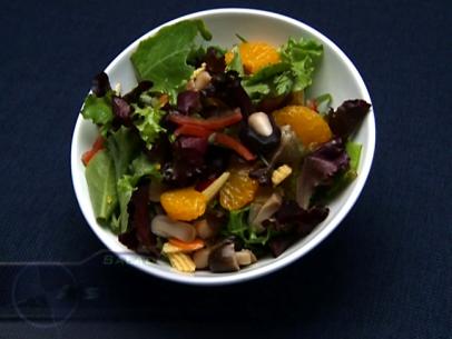 • 6 cups mixed mesclun greens, soaked in salt water to remove grit, dried in a salad spinner and torn into bite sized pieces