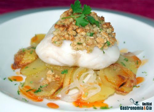 Sirve la Merluza al horno con costra de almendra con la patata como base, espolvorea sobre el plato un poco de perejil picado y riega con unas gotas de ajada. ¡Buen provecho