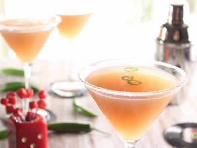 Chill 4 martini glasses. Rim each with a lemon half and then dip in sugar. Squeeze into a shaker the lemon juice from the halves you used to rim the glasses. Place the peppers in the shaker and muddle. Add to the shaker: mandarin vodka, orange juice, cranberry juice and simple syrup. Top with some ice, shake and strain into the glasses. Garnish each with a couple of small slices of serrano pepper.