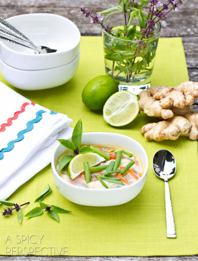 Add the stock, coconut milk, fish sauce and crushed red pepper. Bring to a boil. Simmer for 10 minutes. Then add the sliced chicken. Stir to separate, then simmer another 5-8 minutes until the chicken is cooked through.