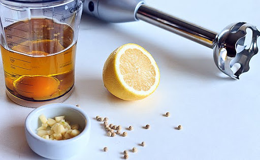 Once your mixture feels like real mayo, add the chopped garlic, salt and pepper. Mix well and enjoy. Keep in an airtight container in the fridge and consume over the next few days (make sure to use the freshest, high-quality eggs available).