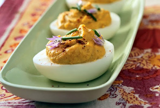 5. Garnish each egg half with a sprinkling of paprika, chopped chive flowers, and freshly cracked pepper.