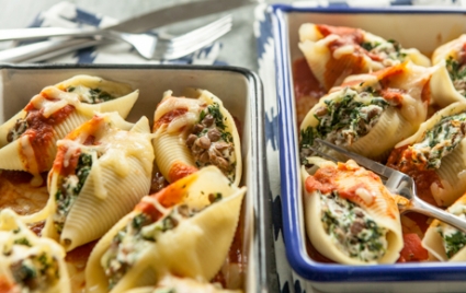 Per Serving:Serving size: about 5 stuffed shells, 430 calories (110 from fat), 12g total fat, 6g saturated fat, 35mg cholesterol, 810mg sodium, 55g carbohydrate (7g dietary fiber, 13g sugar), 23g protein