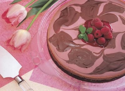 3. Pour half of raspberry mixture into prepared crust. Drop small spoonfuls of about half of chocolate mixture over raspberry. Repeat procedure with remaining mixture, ending with chocolate on top; gently swirl with knife or metal spatula for marbled effect.