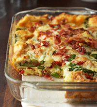 1. Lightly coat a 3-quart rectangular baking dish with cooking spray; set aside. In a medium bowl combine bacon, asparagus, and red peppers.