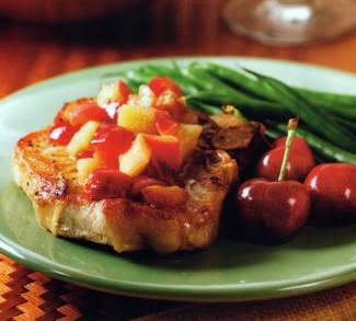 To serve, drizzle sauce over pork chops. Garnish with cherries on the side.