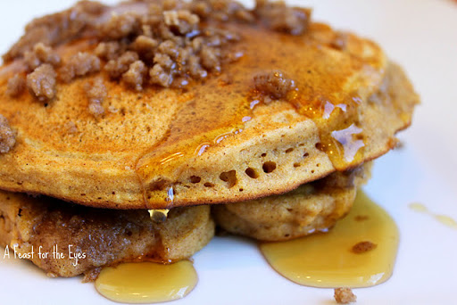 The batter takes less than 5 minutes to make, and the streusel takes another 5 minutes. While the batter is puffing into perfect pancakes, with a perfect balance of fall spices, streusel is sprinkled on top. These pancakes have a blend of both unbleached and whole wheat flour. The pancakes are moist, every so slightly dense, and delicious. Drizzle some pure maple syrup on top, and these remind me of pumpkin streusel muffins. This recipe was slightly adapted from "Two Peas and Their Pod".