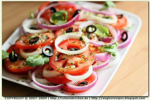 To prepare salad, alternate tomato and onion slices on a serving platter. Sprinkle with salt. Top with olive rings, parsley and baby arugula if used.