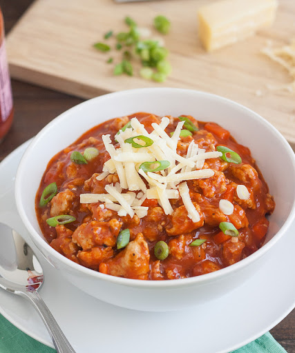 Set a large pot over medium to medium-high heat and add the oil. Add the ground chicken and cook until browned, breaking it up with a wooden spoon as it cooks. Stir in the carrots, onion, celery, garlic, chili powder, cumin, paprika, salt, and pepper. Cook for about 8-10 minutes, stirring often, until the veggies have softened. Add the chicken broth and scrape the bottom of the pan to release any brown bits. Stir in the hot sauce, tomato sauce, and crushed tomatoes. Bring the mixture to a boil, then reduce the heat and simmer until the veggies are tender and the chili has thickened to your desired consistency. (Sometimes I do it for as little as 15 minutes, but I’ve also let it go for more than an hour – just depends how much time I have when I’m making it. Just be aware that it starts off fairly thin, and will need closer to an hour if you want it to thicken up considerably.)