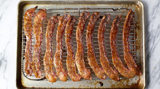 1. Preheat the oven to 375°. Line a baking sheet with aluminum foil and top with a roasting rack. Lightly spritz the rack with nonstick spray. Lay the bacon on the rack, leaving just a tiny bit of room between each piece.