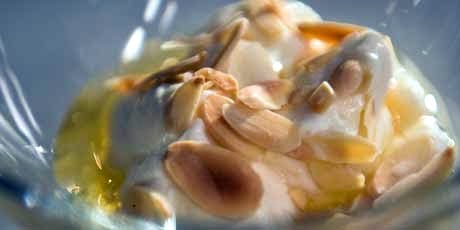 1. Place a strainer over a deep bowl. Line the strainer with 3 layers of cheesecloth (or 1 large coffee filter or 3 layers of extra-strength paper towel). Pour the yogurt into the strainer. Cover, refrigerate and let drain for 5 hours or overnight. Serve drizzled with honey and sprinkled with almonds.