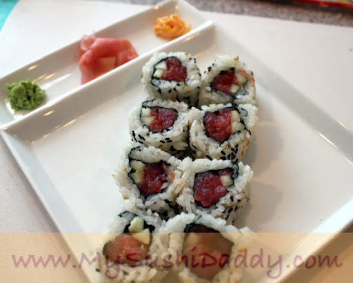 Cut the sushi roll in half, and wipe the knife. Line up the sushi rolls and cut again and then once again ensuring uniformly sized pieces. This roll is absolutely stunning with the yellow fin tuna, and beautiful sesame seed topping. Consider serving this roll with mayo, masago, or additional toasted sesame seeds. Wasabi, pickled ginger, and spicy mayo are a must have for this delectable delight.