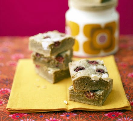 Heat oven to 180C/fan 160C/gas 4. Butter, then line, a shallow rectangular tin, approx 25cm x 22cm. Melt the butter in a pan, then cook gently for about 5 minutes, until the white solids turn golden and the butter smells biscuity and sweet. Cool for 5 minutes, then add half the white chocolate and set aside for a couple of minutes to melt. Stir until smooth.