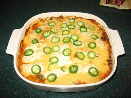 1 Preheat oven to 400°. 2 Cook ground beef and onion in a large skillet until beef is browned, and onions tender, drain. 3 Stir in salsa (can make smoother in texture in the food processor, if you desire), water and taco seasoning packet; bring to a boil until some of the water as boiled off and it is the sauce is saucy not thin and watery. 4 Reduce heat to low and stirring occasionally, for 3-4 minutes. Add olives, if using, and stir. 5 In a medium sauces pan: combine cornmeal, evaporated milk, green chilies, 1/2 C cheese and salt. Cook over medium heat, stirring constantly for 5-7 minutes or until thickened (to the consistency of thin oatmeal). 6 In a 8x8 ungreased baking dish: Spoon in meat filling, then spread cornmeal on top of meat mixture. 7 Bake for 25 minutes, sprinkle with remaining cheese and garnish w/ jalapenos. Bake an additional 5 minutes until cheese is melted.