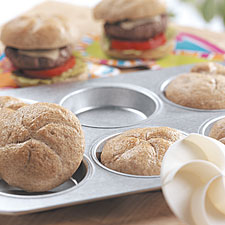 Turn the dough out onto a lightly greased work surface. Divide dough into six balls, and place in a lightly greased hamburger bun pan, or on a parchment-lined baking sheet, flattening slightly. Center the kaiser roll cutter over each ball, and press down firmly, cutting to the bottom but not all the way through the dough.