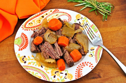 6. Place the roast, onions and carrots back into the pot and add enough beef stock to just cover the meat(about 2 to 3 cups). Toss in 3 or 4 sprigs each of fresh rosemary and thyme (or desired amount).