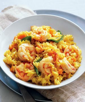 Season the shrimp with ½ teaspoon salt and ¼ teaspoon pepper and nestle them in the partially cooked rice.