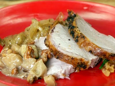 Remove the strings from the roast and slice into 1/2-inch thick pieces and arrange over the apple mixture. Drizzle some sauce over meat and serve the rest on the side.
