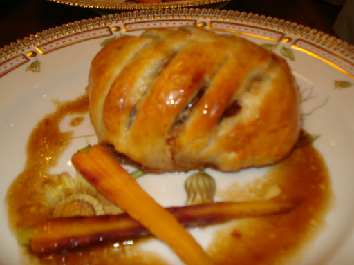 Brush the top of the pastry with egg wash then make a couple of slits in the top of the pastry using the tip of a paring knife - this creates vents that will allow the steam to escape when cooking. Bake for 40 to 45 minutes until pastry is golden brown and beef registers 125 degrees F on an instant-read thermometer. Remove from oven and rest before cutting into thick slices. Garnish with minced chives, and serve with Green Peppercorn Sauce, Roasted Fingerling Potatoes, and Warm Wilted Winter Greens.
