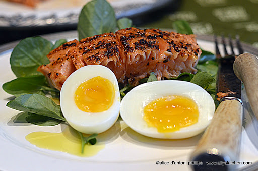 Put equal amounts of watercress on each plate. Drizzle with some of the olive oil, salt and pepper. Place the salmon piece atop the watercress. Slice the soft boiled egg in half on the plate. Serve and eat!