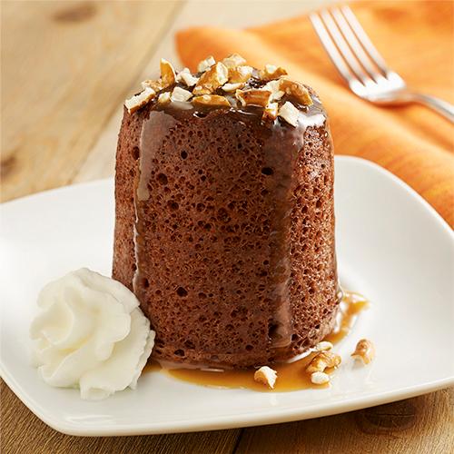 Microwave each mug individually on HIGH 1 minute to 1 minute 15 seconds or until set. Invert each cake onto plate. Top with caramel syrup and sprinkle with crushed pretzels. Serve immediately with additional Reddi-wip, if desired.