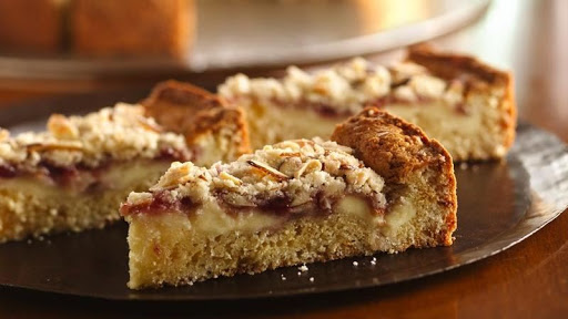 Pour filling over batter. Carefully spoon preserves evenly over filling. Mix almonds and reserved crumb mixture; sprinkle over preserves.