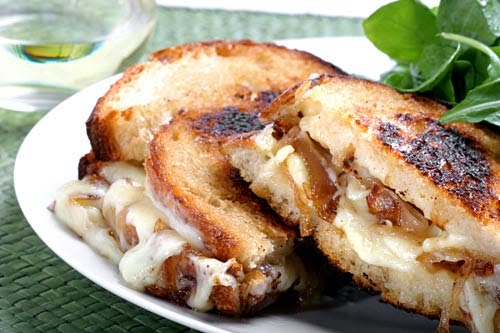 3. Place the pan in the oven and cook 5 to 6 minutes until the cheese is melted and the bread is golden and crispy. Remove to a cutting board and carefully assemble the sandwich, placing together the two slices of bread. Cut in half on the diagonal and serve immediately.