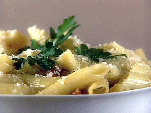 In a large pot, boil 6 quarts of salted boiling water. Add pasta and cook until al dente, about 8 to 10 minutes. Drain pasta in a colander. Do not rinse with water; you want to retain the pasta's natural starches so that the sauce will stick. While the pasta is still hot, return it back to the pot. Add the browned pancetta and mix well. Add the cream mixture and coat the pasta completely. It's important to work quickly while the pasta is still warm so that the cream mixture will cook, but not curdle. Add remaining Parmesan and chopped parsley.