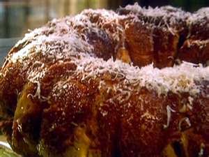 5. Let cool in pan, 10 minutes; invert bread onto a serving plate. Drizzle remaining 1/4 cup melted butter on top and sprinkle with grated Parmesan.