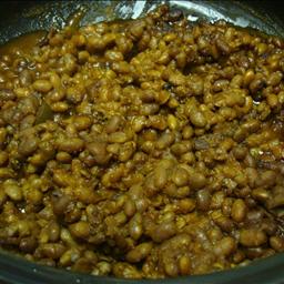 4. Cut bacon into one-inch bits, then in a pot on the stove top, cook until fat rendered. Add all other ingredients, including the reserved water. Heat and stir for about 5 mins, then add to beans in the crock pot and cook on high for 6 hours, stirring every two hours.