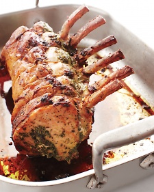 Evenly spread herb mixture on top, leaving a 1/2-inch border.Tightly roll pork toward bones and secure with kitchen twine between bones. Season generously with salt and pepper. Place pork in a heavy-bottomed metal roasting pan.