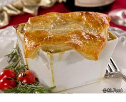 Spoon mixture evenly into 4 ramekins or 2-cup-size ovenproof bowls. Cut puff pastry into 4 squares and place over top of each ramekin, allowing pastry to overhang the rim. Brush with egg.