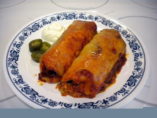 Place about 1/2 c of meat/cheese/bean mixture in center of tortilla. Fold over ends and roll. Place each roll, seam side down, in glass dish.
