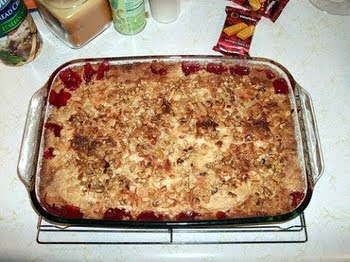3. Dump pineapples into the pan first, then pie filling, cake mix after that, followed by the butter, then the coconut, and finally the pecans. (No need to mix, just dump into baking dish in the listed order)