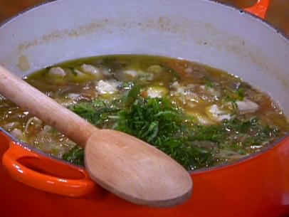 Heat a large heavy-bottomed soup pot with vegetable oil, 2 turns of the pan, over high heat. Once you see the oil ripple, add the sliced onion, chopped garlic and sliced peppers. Season the vegetables with salt and pepper and cook, stirring frequently, for 2 minutes. Add 1 cup shredded carrot and 6 cups chicken stock or broth. Cover with a lid and bring up to a simmer. Once simmering, add the chicken simmer 5 minutes then add noodles and simmer 5 minutes more. Remove the soup from the heat and add the cilantro, basil and the juice of 1 lime.