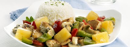 3. Cook chicken in same skillet, until chicken is browned. Add vegetables back to skillet with sweet and sour sauce, soy sauce, pineapple chunks and reserved juice. Heat through. Serve over hot cooked rice.