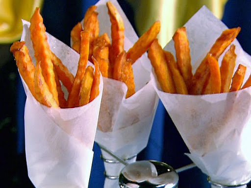 - •5 sweet potatoes, peeled and sliced into 1/4-inch long slices, then 1/4-wide inch strips, using a crinkle cut knife